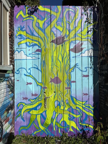 The Governor’s School for the Arts visual art students repainted a small fence in Magazine Lane as part of a biannual art project for NEON. This painting replaced a previous mural painted by Governor’s School for the Arts student Aspen Knight.