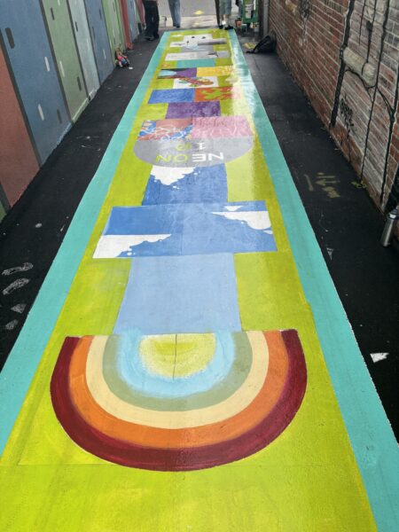 The sixth iteration of the alley “rug” was painted by The Governor’s School for the Arts visual arts students for the tenth anniversary of the NEON District. The rotating art site in Magazine Lane, between 801 Granby and Hurrah’s Copeland Center is a popular selfie spot in NEON.
